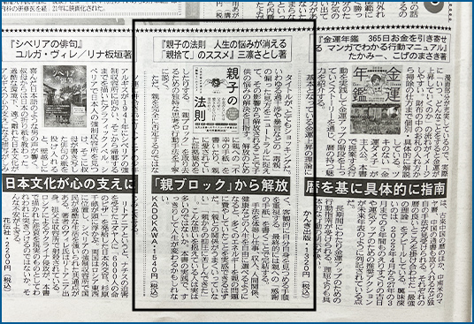 お知らせ 夕刊フジに「親子の法則」の書評が掲載されました。 2022.03.15 夕刊フジに「親子の法則」の書評が掲載されました! Post Share Hatena Pocket RSS feedly Pin it STORY webに掲載されました。 発売1週間でたちまち重版決定! Amazonランキン...