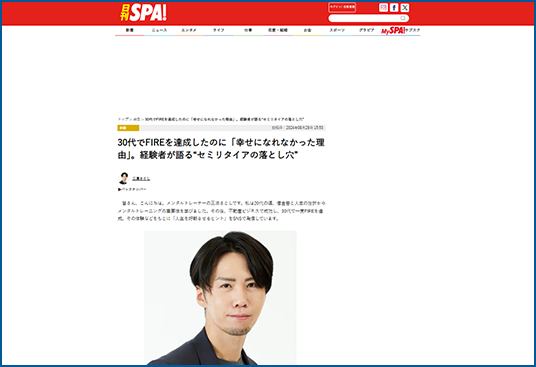 日刊SPA!に「30代でFIREを達成したのに「幸せになれなかった理由」。経験者が語る“セミリタイアの落とし穴”」が掲載されました。