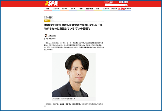 日刊SPA!に30代でFIREを達成した経営者が実践している「成功するために意識している“7つの習慣”」が掲載されました。