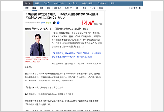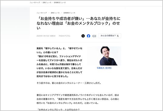 そう話すのは、富とお金のメンタルトレーナー・三凛さとし氏だ。 書店にはキャリアデザインや資産運用系のノウハウ本がいくつも並んでいるが、彼は自身の著書の中で、「資産を増やす方法を学んでも上手く増えない原因は、心の奥に根付いた『お金のメンタルブロック』のためだ」と説いている。 「お金のメンタルブロック」とは何なのか?