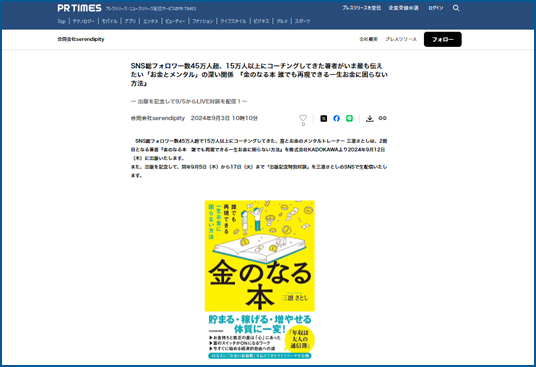 PR TIMESに弊社の『金のなる本 誰でも再現できる一生お金に困らない方法』が掲載されました。