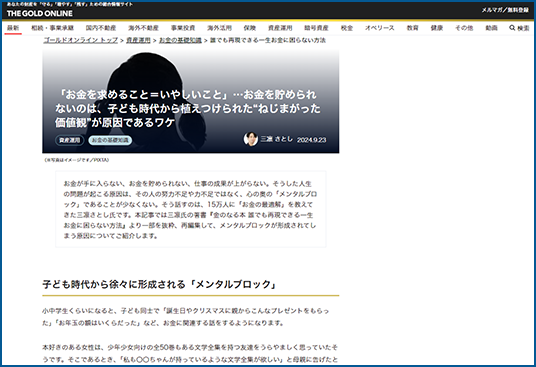 3. THE GOLD ONLINEに「「お金を求めること=いやしいこと」…お金を貯められないのは、子ども時代から植えつけられた“ねじまがった価値観”が原因であるワケ」が掲載されました。