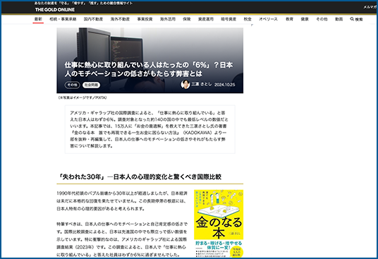 THE GOLD ONLINEに「仕事に熱心に取り組んでいる人はたったの「6%」?日本人のモチベーションの低さがもたらす弊害とは」が掲載されました。
