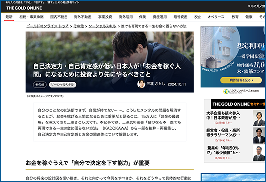 THE GOLD ONLINEに自己決定力・自己肯定感が低い日本人が「お金を稼ぐ人間」になるために投資より先にやるべきことが掲載されました。