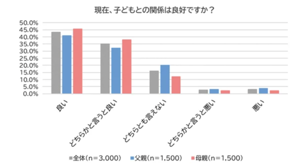続いて、「現在の子どもとの関係」について尋ねたところ、8割弱が「良い」(全体:43.3%、父親:40.9%、母親:45.7%)または「どちらかと言うと良い」(全体:35.1%、父親:32.1%、母親:38.0%)と回答。