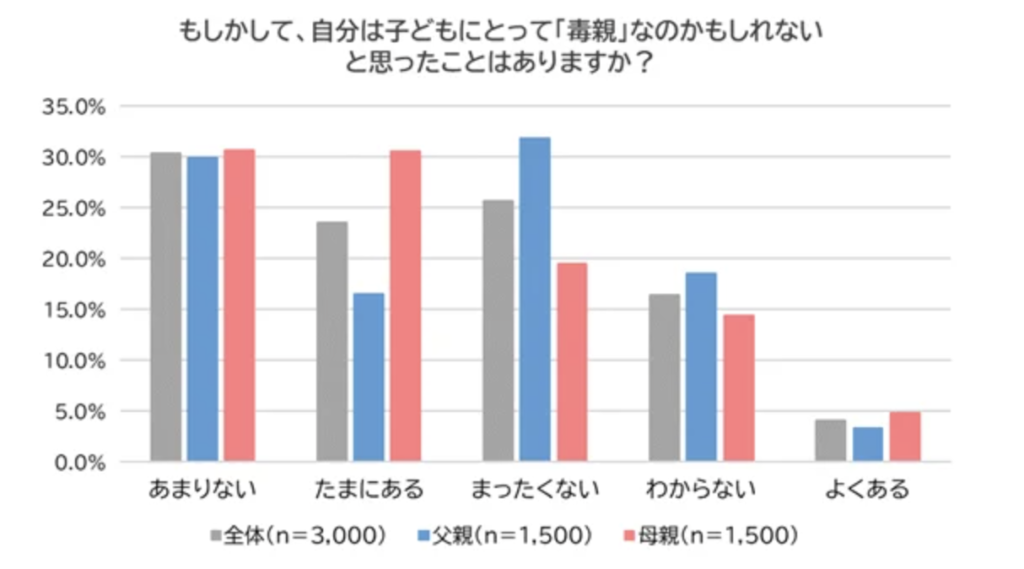 調査は、25歳以上60歳未満の父母3,000人(男性:1,500人、女性:1,500人)に対して行われました。最初の質問では、「現在または過去に、自分の子どもに対してした言動で、毒親だった、と思い当たることはありますか」と尋ねました。