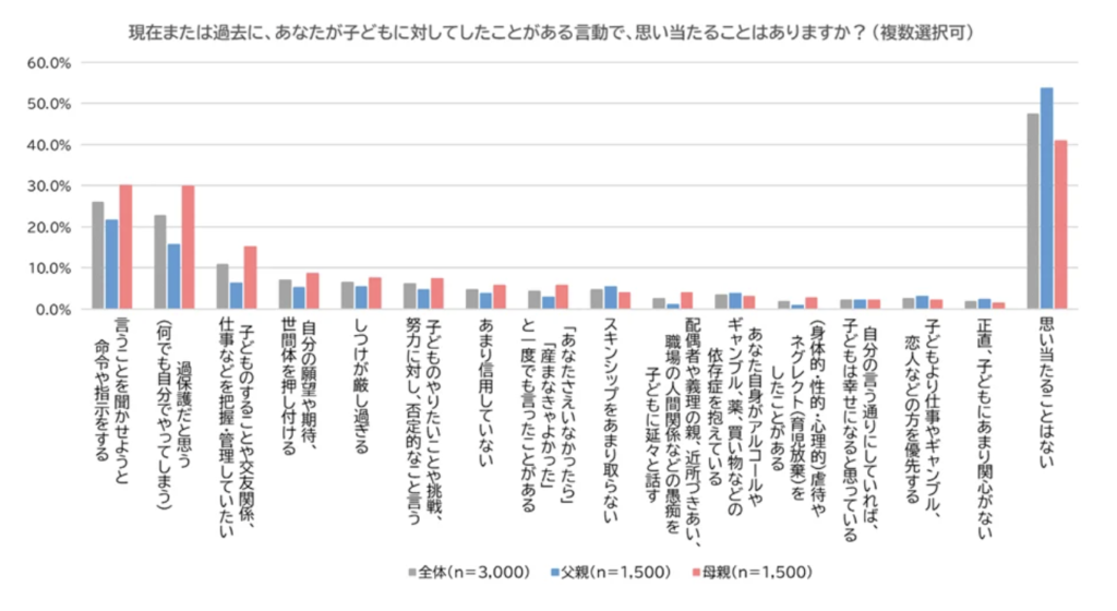 一方、思い当たることでは「言うことを聞かせようと命令や指示をする」(全体:25.9%、父親:21.6%、母親:30.1%)が最も多く、「過保護だと思う(何でも自分でやってしまう)」(全体:22.8%、父親:15.7%、母親:29.9%)、「子どものすることや交友関係、仕事などを把握・管理していたい」(全体:10.7%、父親:6.3%、母親:15.2%)と続き、父親よりも母親の方が思い当たる人の割合が多いこともわかりました。